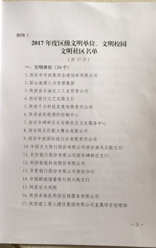 2017年,陜西千方科技發(fā)展有限責任公司申請“區(qū)級文明單位”,經(jīng)過一年的努力,公司在參與文明城市建設(shè)、學雷鋒、樹立公司形象等方面取得了一定成績,并于2018年3月20日正式授牌。